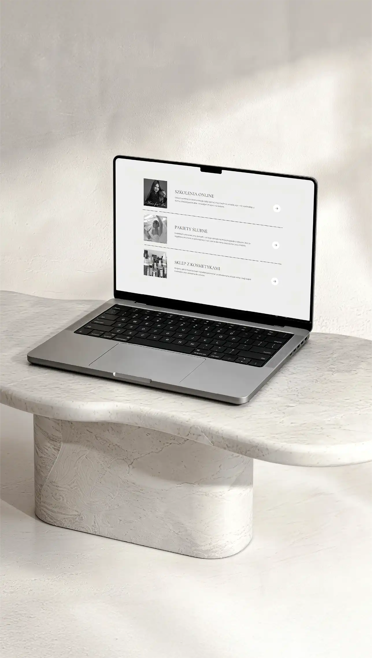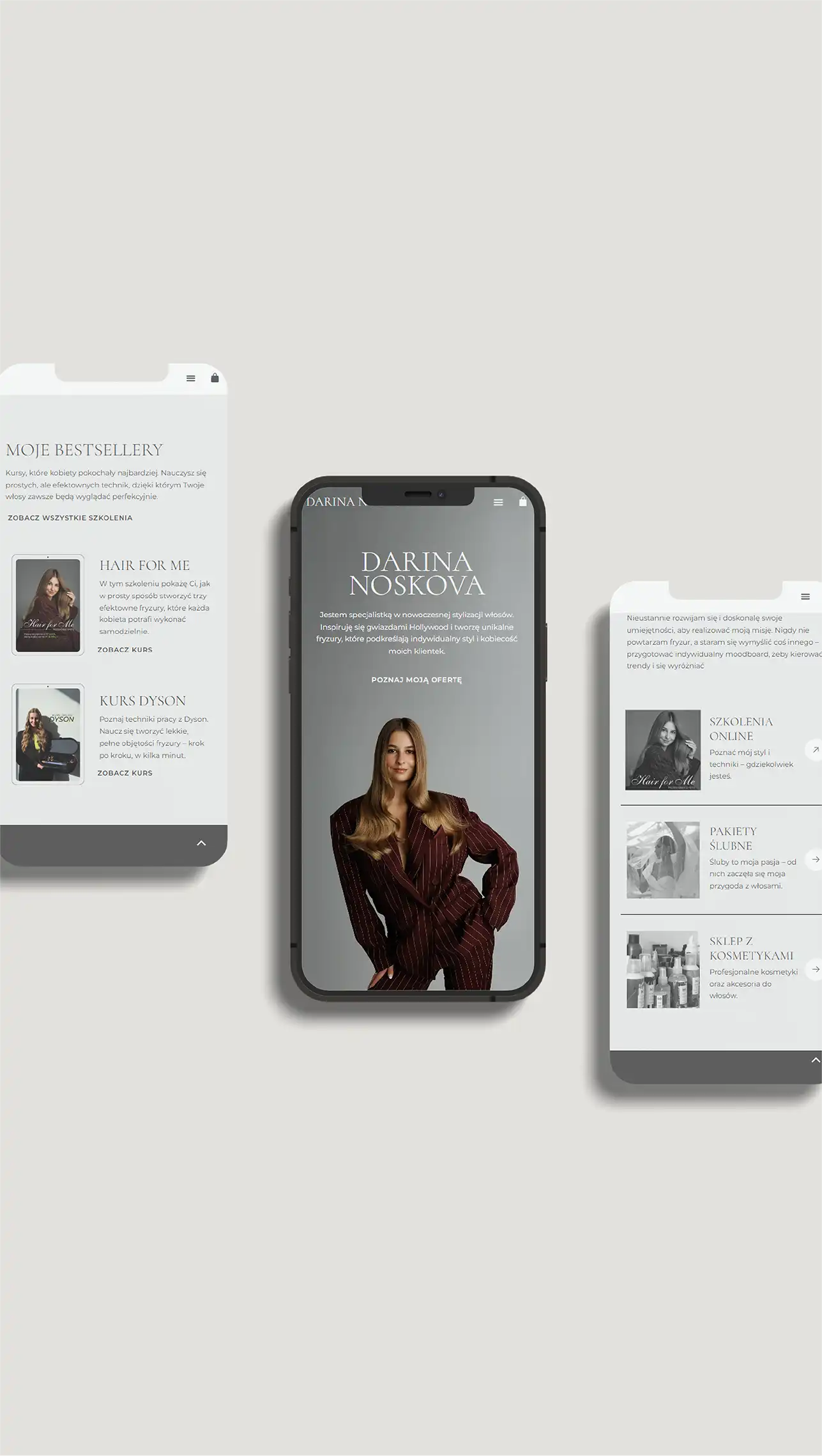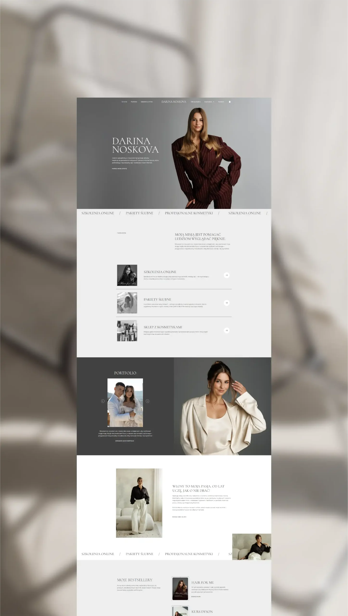 Układ jest przejrzysty i intuicyjny, a jednocześnie pozwala wyeksponować różne filary działalności – szkolenia online, pakiety ślubne oraz sklep z profesjonalnymi kosmetykami. Całość buduje wizerunek ekspertki, która łączy estetykę z doświadczeniem i pewnością siebie. To projekt nowoczesny, dopracowany i spójny z charakterem silnej marki osobistej.