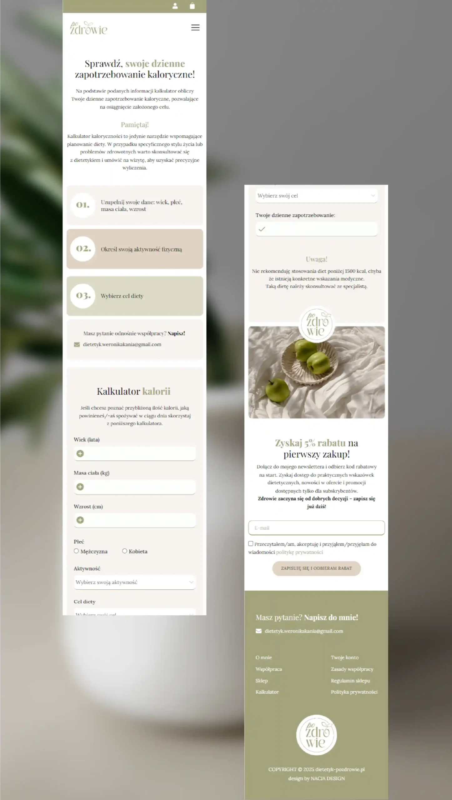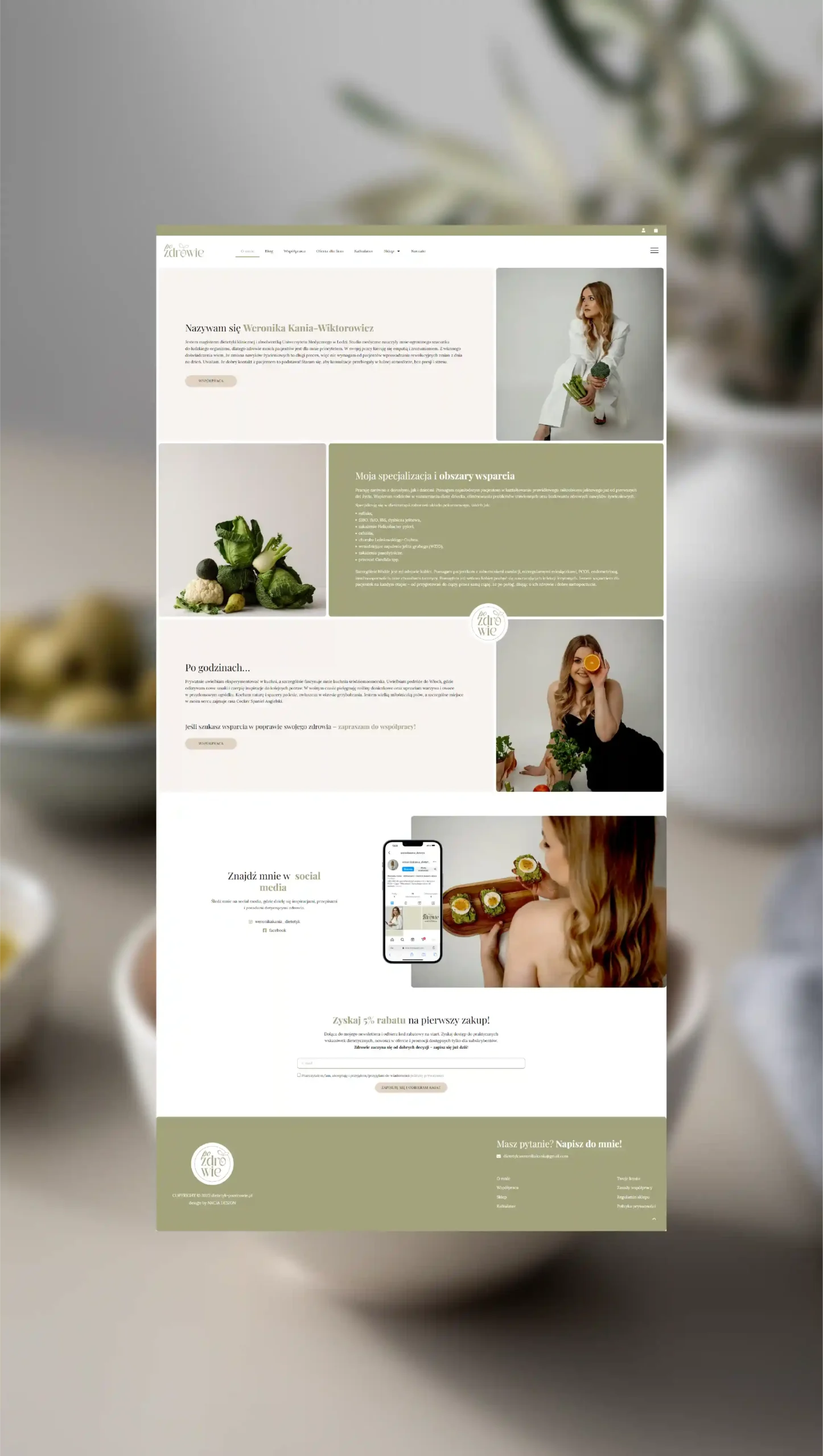 Strona Weroniki emanuje spokojem i lekkością – to projekt, który od pierwszego spojrzenia buduje zaufanie. Delikatna, naturalna kolorystyka z przyjemnym akcentem zieleni nawiązuje do logo i wartości marki. Całość jest spójna, przejrzysta i przyjemna w odbiorze – zarówno wizualnie, jak i funkcjonalnie. Subtelne detale graficzne, autorskie zdjęcia i łagodne animacje tworzą wrażenie lekkości i profesjonalizmu, idealnie oddając charakter holistycznego podejścia.